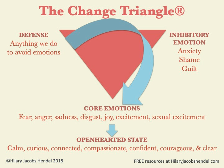 Hilary: The Change Triangle is a map that illustrates how emotions function in the mind and body. The goal is to identify the ways we block our core emotions (with inhibitory emotions and defenses) so we can ultimately validate them.